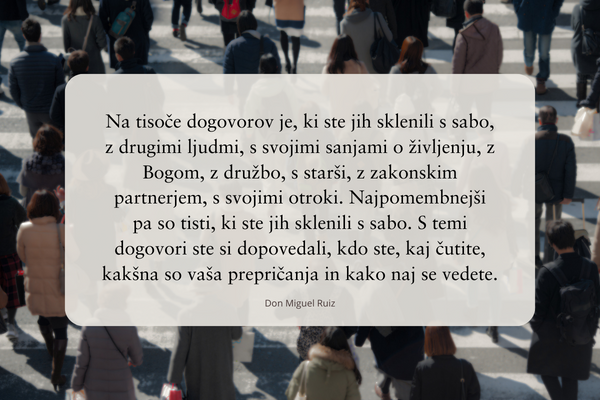 »Na tisoče dogovorov je, ki ste jih sklenili s sabo, z drugimi ljudmi, s svojimi sanjami o življenju, z Bogom, z družbo, s starši, z zakonskim partnerjem, s svojimi otroki. Najpomembnejši pa so tisti, ki ste jih sklenili s sabo. S temi dogovori ste si dopovedali, kdo ste, kaj čutite, kakšna so vaša prepričanja in kako naj se vedete.« (Ruiz, str. 19)
